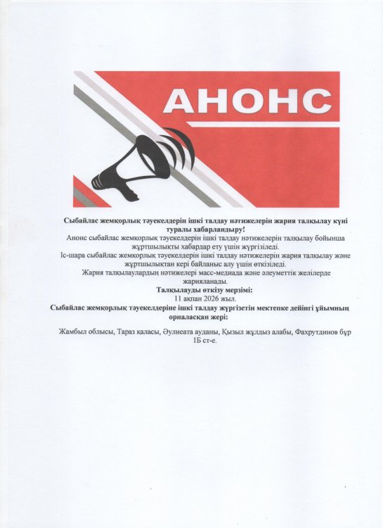 04 ақпан 2026 0 1 2 3 4 5 Сыбайлас жемқорлық тәуекелдерін ішкі талдау нәтижелерін жария талқылау күні туралы хабарландыру