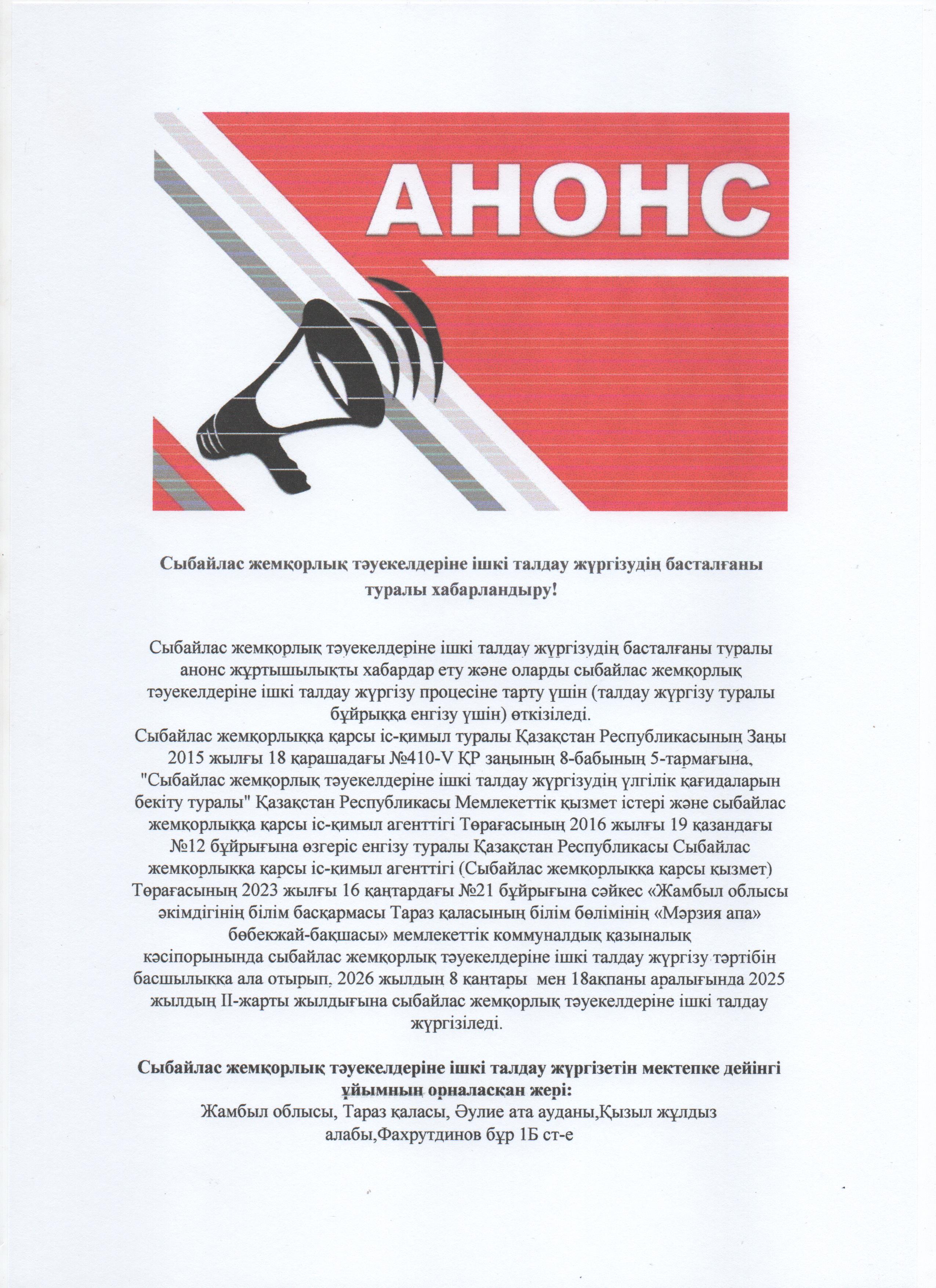 18 желтоқсан 2025 0 1 2 3 4 5 Сыбайлас жемқорлық тәуекелдеріне ішкі талдау жүргізудің басталғаны туралы хабарландыру !